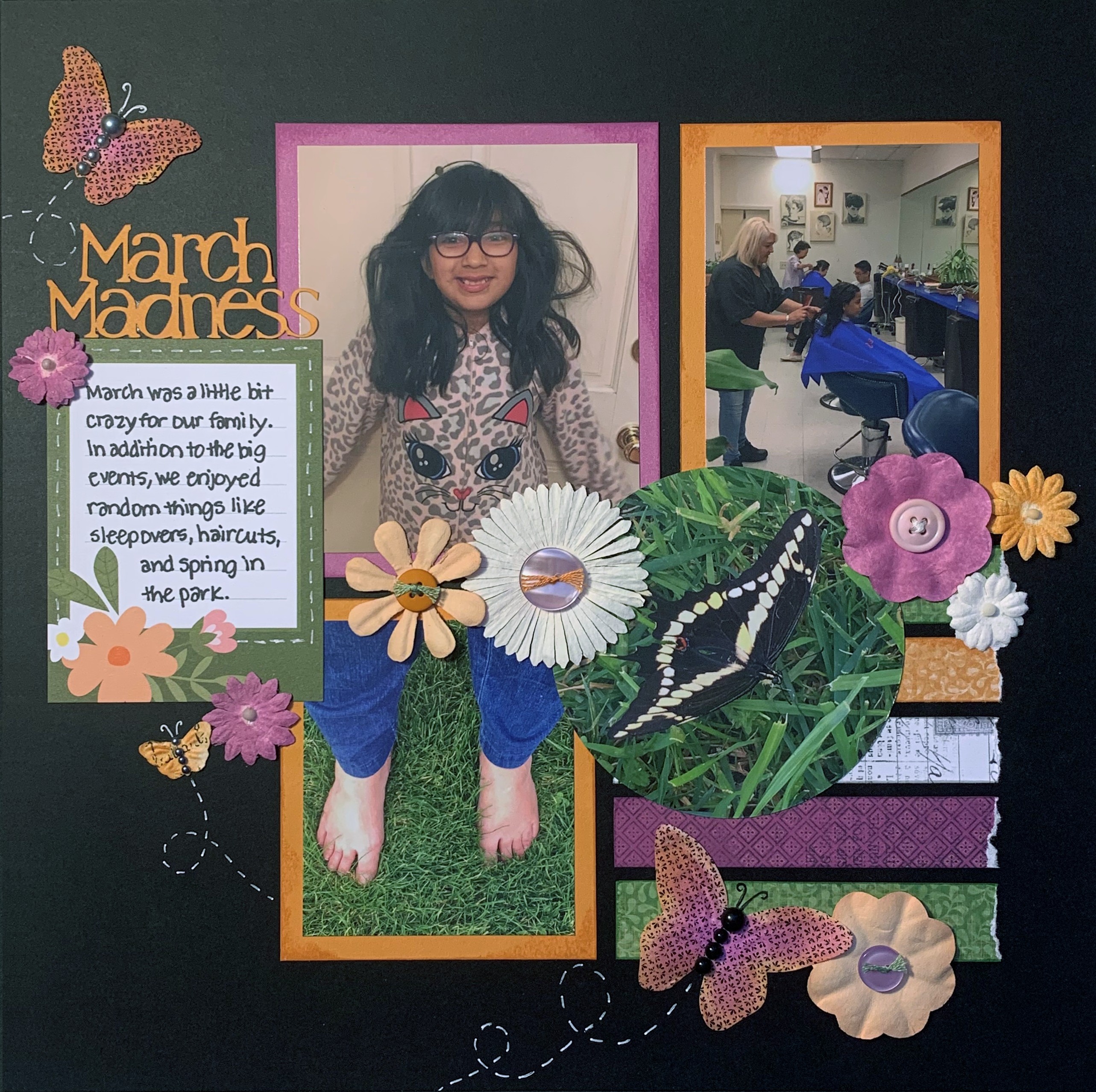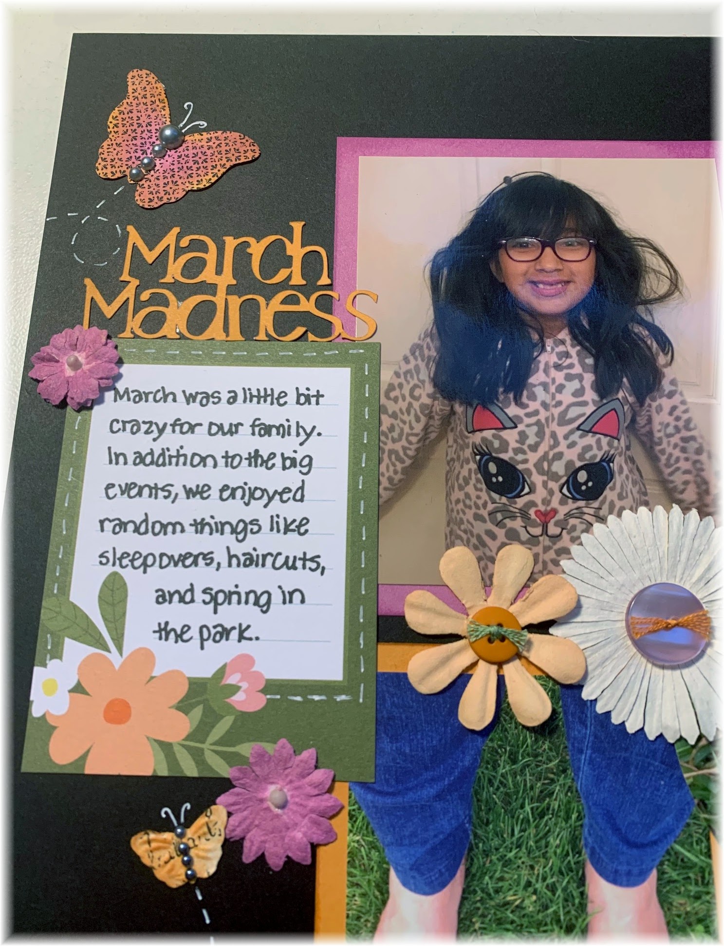 August has been a busy month for me with a family vacation and getting ready for another year of homeschooling, so I have had a hard time getting creative with my scrapbooking. The same photos have been lying on my desk for several weeks, waiting to be scrapped, but I finally found some mojo this week thanks to a few scrappy challenges, so here is my layout at last! Fittingly, the title reflects the topic of the layout: the busyness of March 2017.